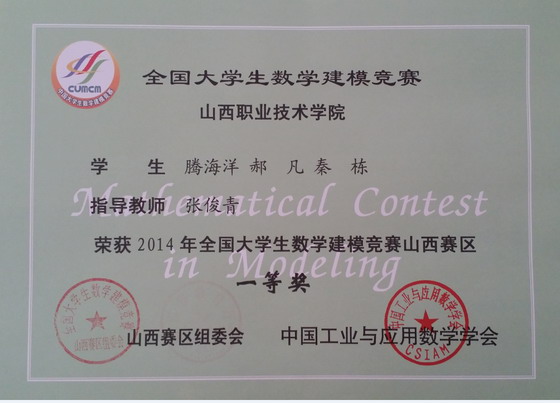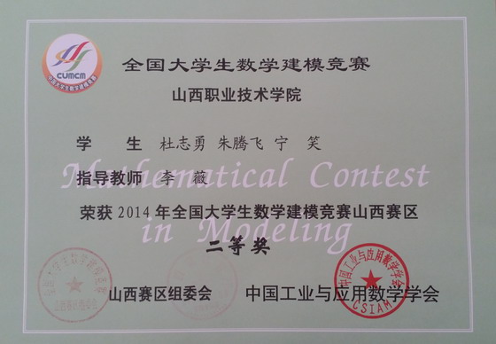 2014年山西赛区共有来自47所院校的1008支队伍参加全国数学建模竞赛,我院代表队获得山西赛区一等奖1个,二等奖1个。