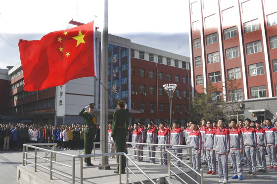 身着绿色军装的旗手,在护旗队的护卫下,迈着整齐、有力的步伐登上升旗台,在高昂的《国歌》声中,全院师生行瞩目礼,鲜艳的五星红旗伴随《国歌》冉冉升起。